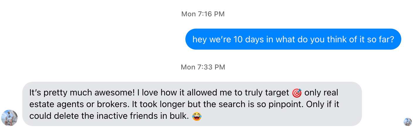 The average reply rate on Facebook is 20%. If you send 1000+ DMs per day that is 200 replies per day.